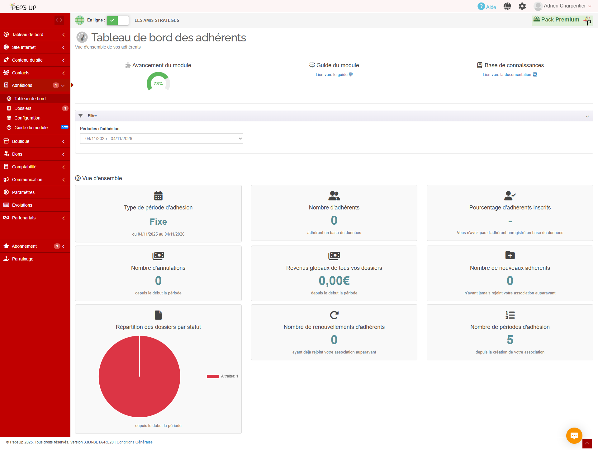 Une fois tous les blocs de configuration validés, une vue d’ensemble s’affiche avec les principales données de votre campagne d’adhésion en cours : le type de période d’adhésion (fixe ou à date d’inscription, avec les dates correspondantes), le nombre total d’adhérents enregistrés, le pourcentage d’adhérents inscrits ayant activé leur compte Peps’up, les revenus globaux collectés via les dossiers d’adhésion, le nombre de nouveaux adhérents (n’ayant jamais adhéré auparavant), le nombre de renouvellements, le nombre de dossiers en cours de création, et le nombre total de périodes d’adhésion créées depuis la naissance de votre association.