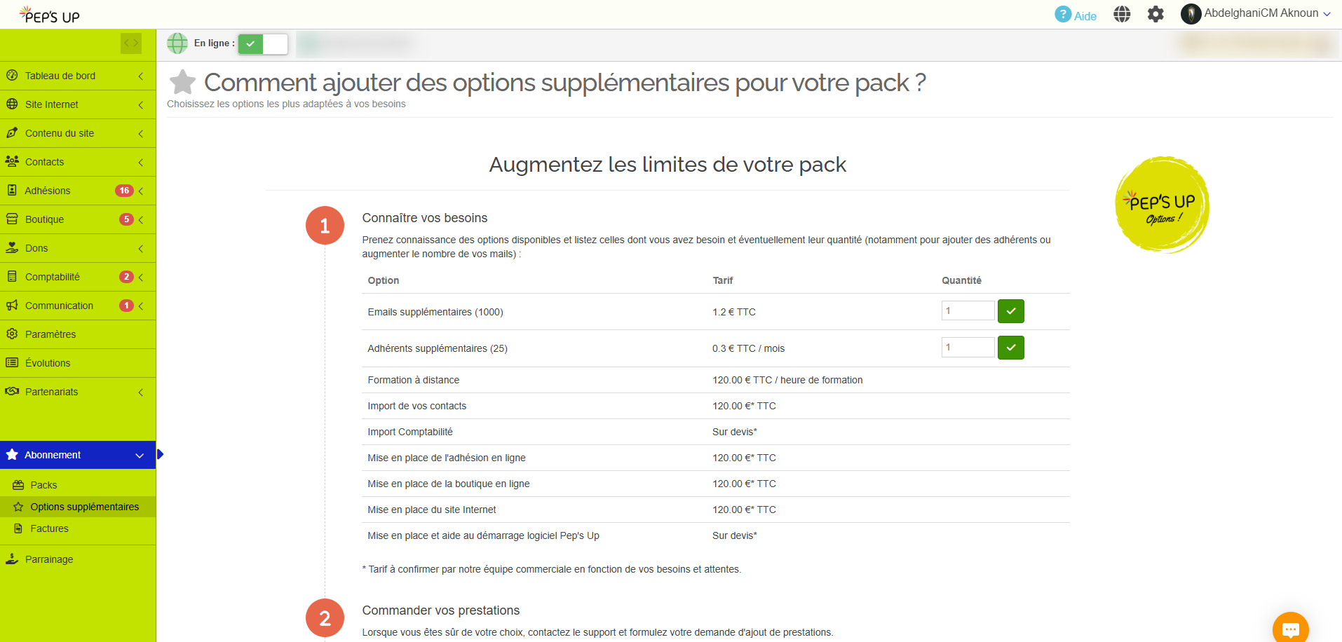 Déjà, cliquez sur le menu Abonnement -> Options supplémentaires pour consulter la page suivante.