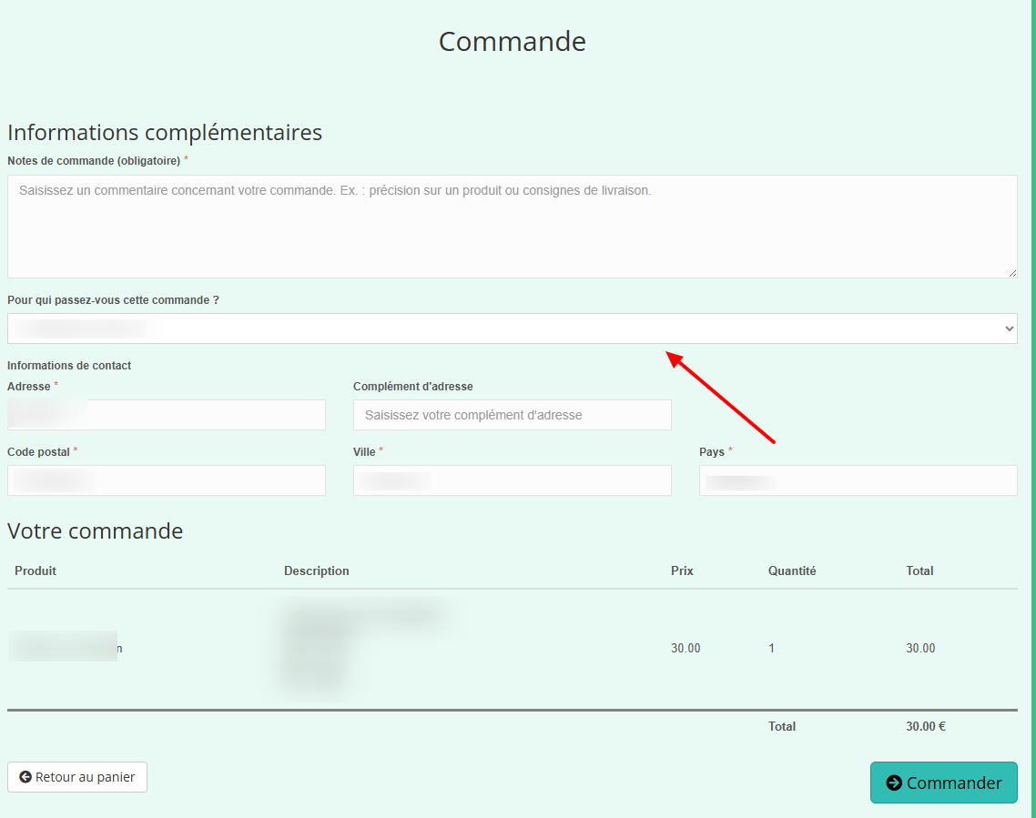 Si vous avez des contacts gérés rattachés à votre profil, un menu déroulant intitulé "Pour qui passez-vous cette commande ?" s'affichera automatiquement. Il vous suffit alors de sélectionner le membre concerné dans la liste :