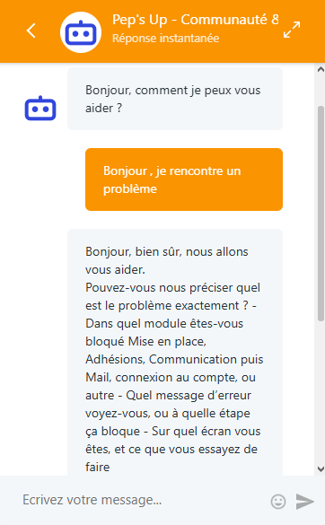 Ouvrez la bulle de chat et expliquez votre problème. L'IA va analyser votre demande, vous poser quelques questions pour affiner le contexte, et vous proposer des solutions ou des articles pertinents issus de notre centre d'aide.