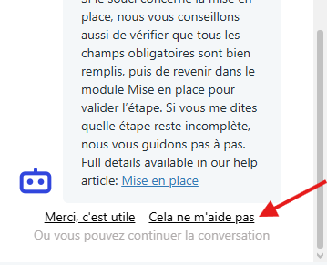 L'IA vous a fourni une réponse mais cela ne règle pas votre souci ? Pas d'inquiétude ! À la fin de chaque proposition de l'assistant, deux options s'affichent : "Merci, c'est utile" et "Cela ne m'aide pas".