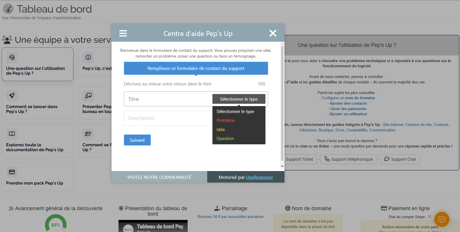 Vous pourrez communiquer soit par email grâce aux notifications, soit directement dans votre espace du centre d’aide : https://centre-aide.pepsup.com/ Userresponse va vous créer un compte et (normalement) vous envoyer un mail d'activation, si cela ne s'envoie pas vous pouvez cliquer sur mot de passe oublié pour récupérer celui ci