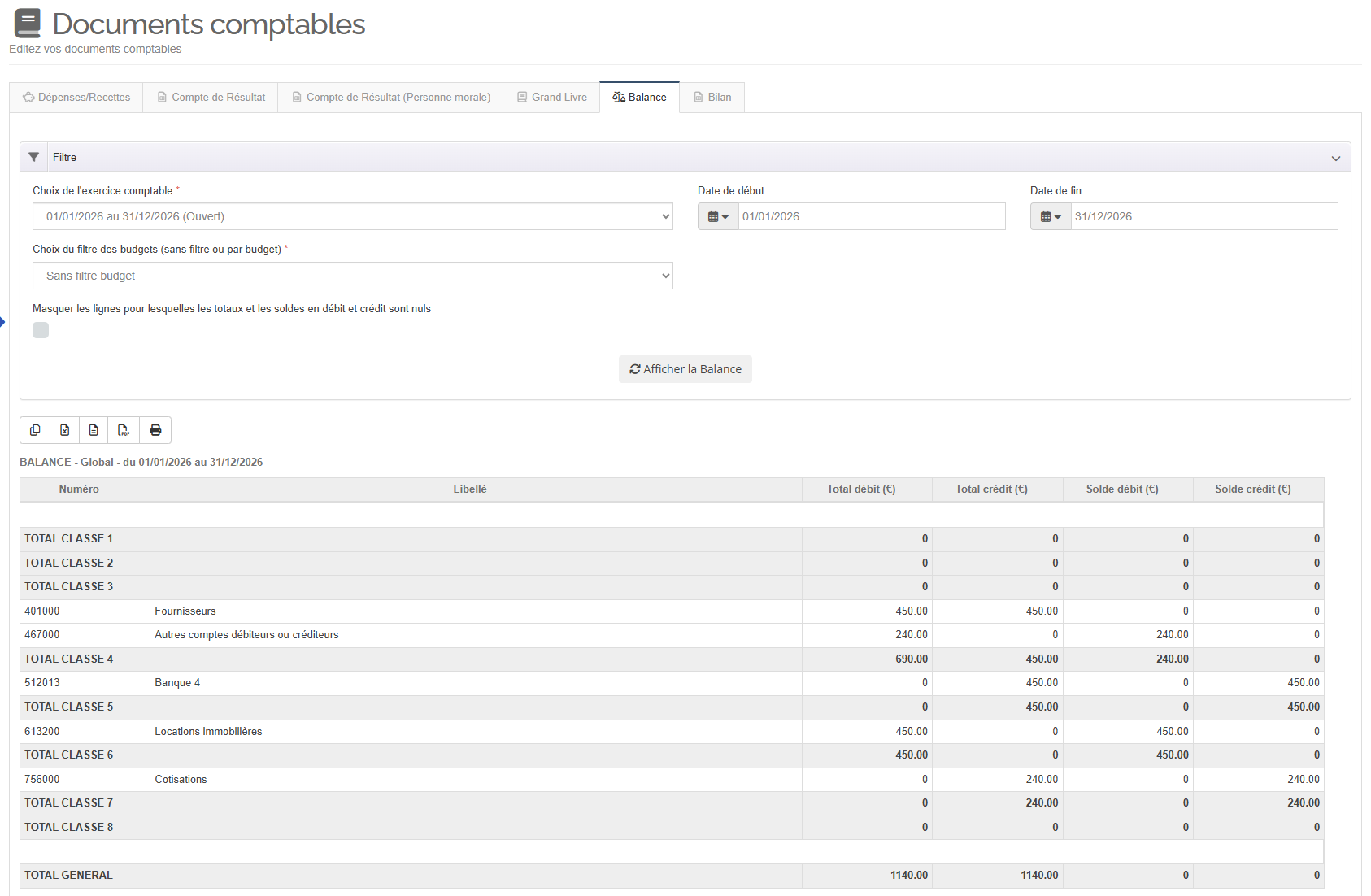 Utiliser la zone de filtre pour choisir un exercice comptable et choisissez un type de document (global = toute opération, ou choisissez un budget en particulier). Vous pouvez également définir une plage de dates en saisissant une date de début et une date de fin. Enfin, une option permet de masquer les lignes pour lesquelles les totaux et les soldes en débit et en crédit sont nuls.