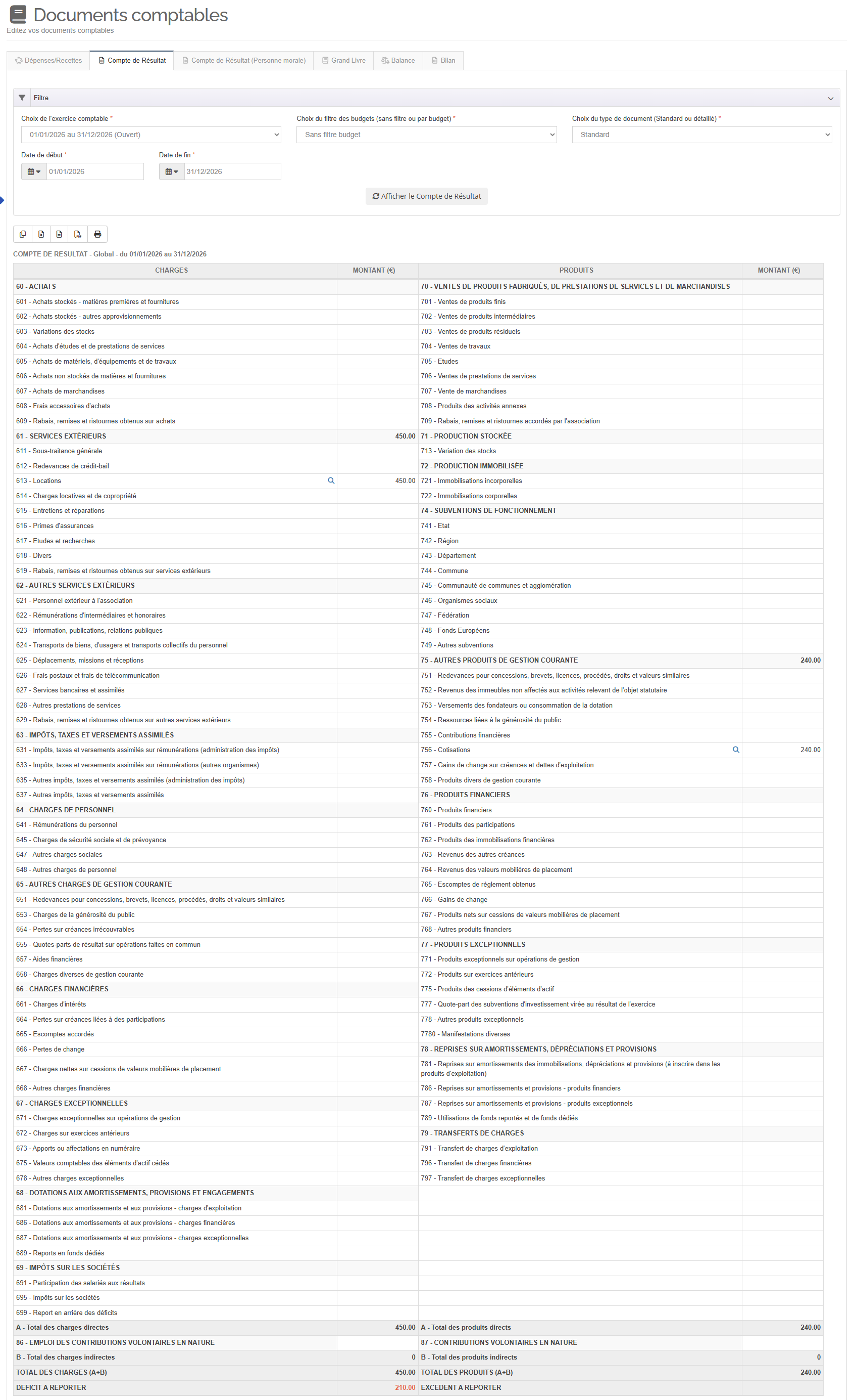 Utiliser la zone de filtre pour choisir un exercice comptable et choisissez un type de document (global = toute opération, ou choisissez un budget en particulier).