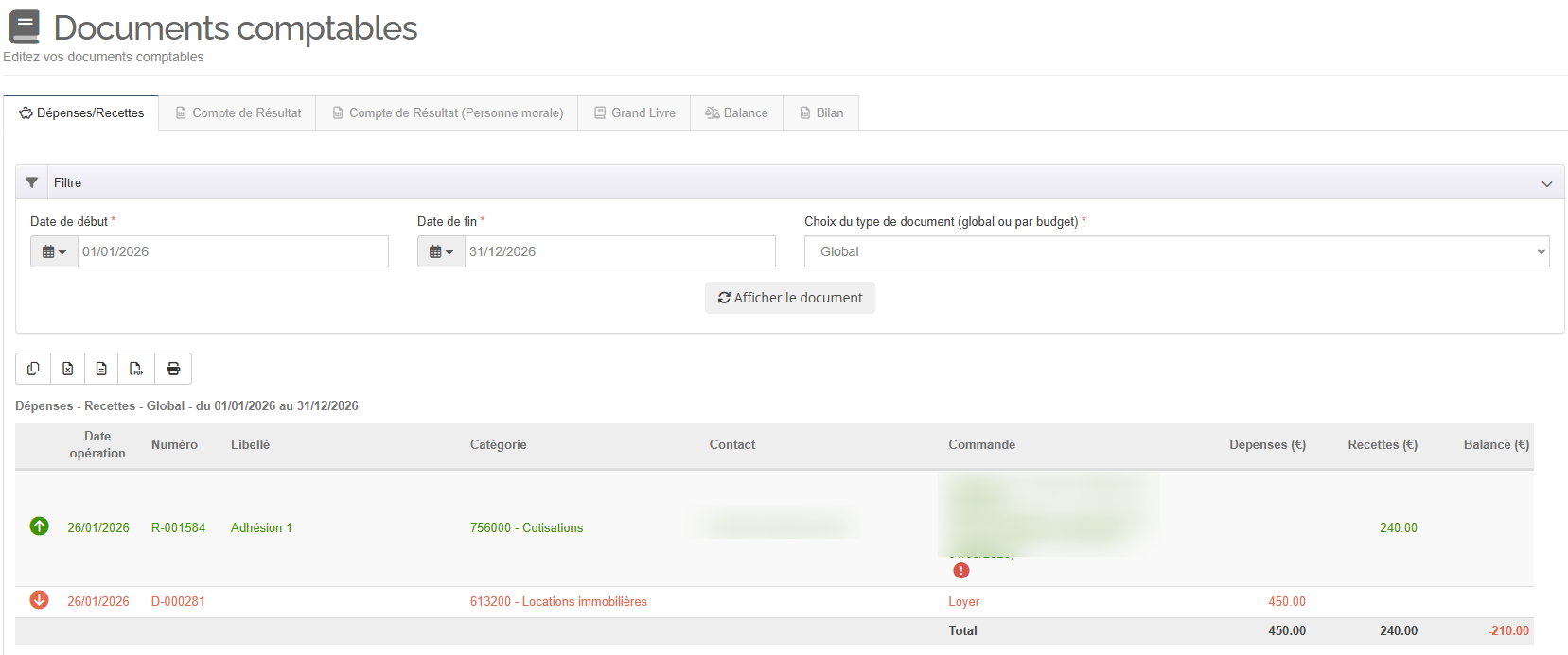Générer le document Dépenses / Recettes
