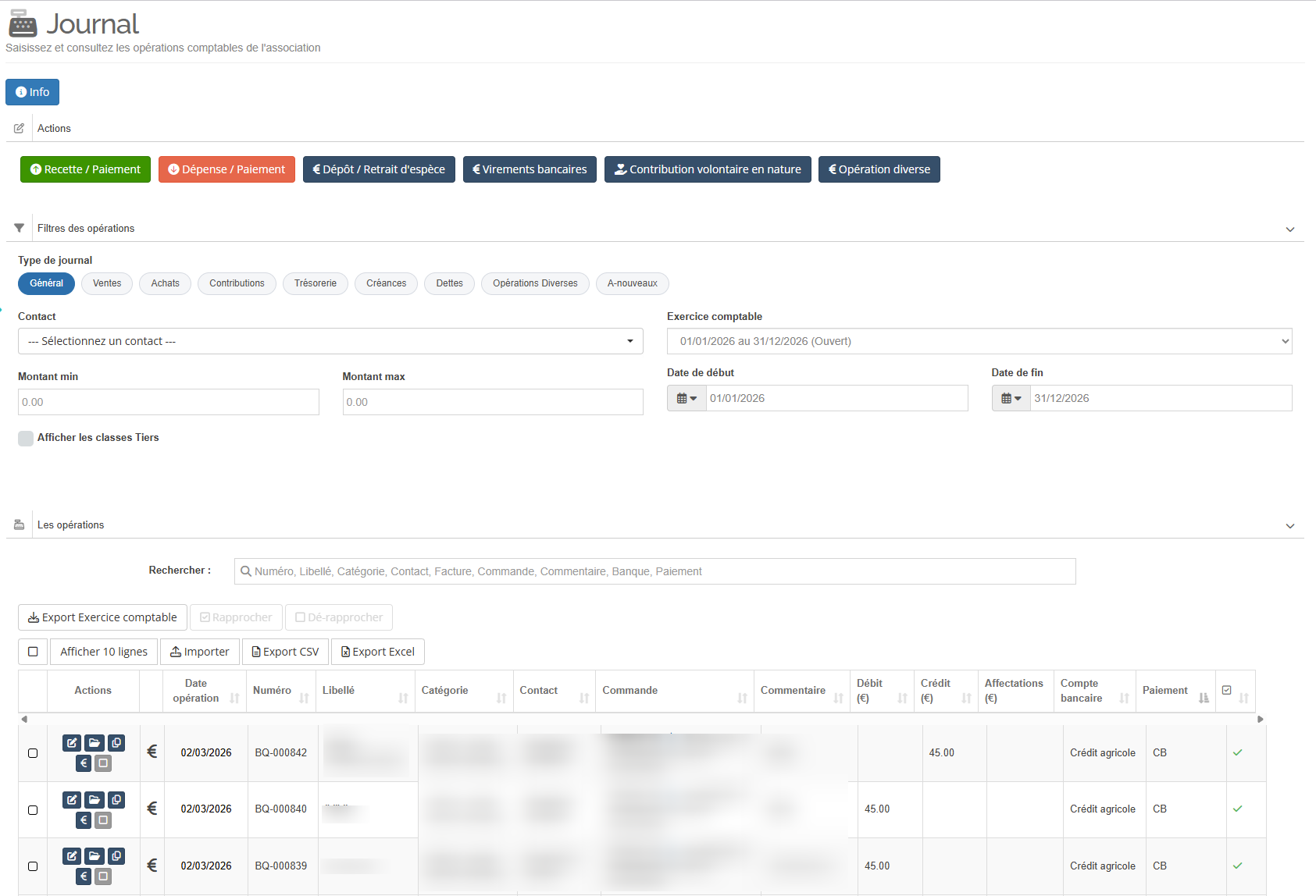Gérez toutes vos opérations comptables (recette/paiement, dépense/paiement, dépôt/retrait d’espèce, virement bancaire, contributions volontaires en nature, opérations avancées).