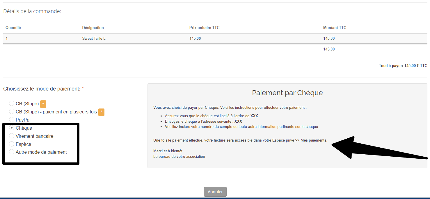 Configurer les instructions affichées aux membres lorsqu’ils choisissent un paiement :