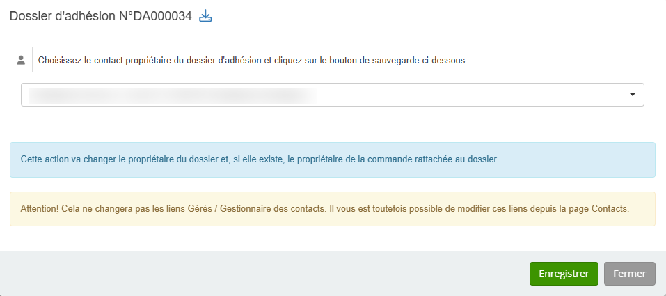 Pour changer le propriétaire d’un dossier d’adhésion, rendez-vous sur la page Dossiers d’adhésion. Dans la colonne Actions, cliquez sur le bouton « Changer le propriétaire » situé en face du dossier concerné. Une fenêtre s’ouvrira vous permettant de sélectionner le nouveau contact propriétaire du dossier d’adhésion. Une fois le contact choisi, cliquez sur le bouton de sauvegarde pour confirmer la modification. Le dossier sera alors automatiquement rattaché au nouveau propriétaire, sans perte d’informations.