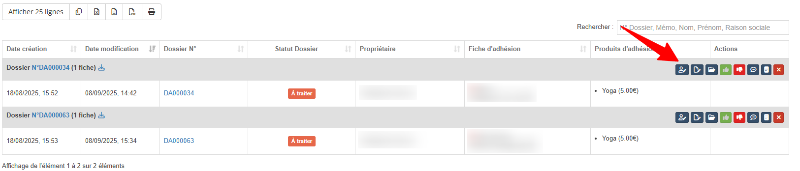 NB : En cliquant sur l’icone « Loupe », vous basculerez directement sur le dossier d’adhésion correspondant.