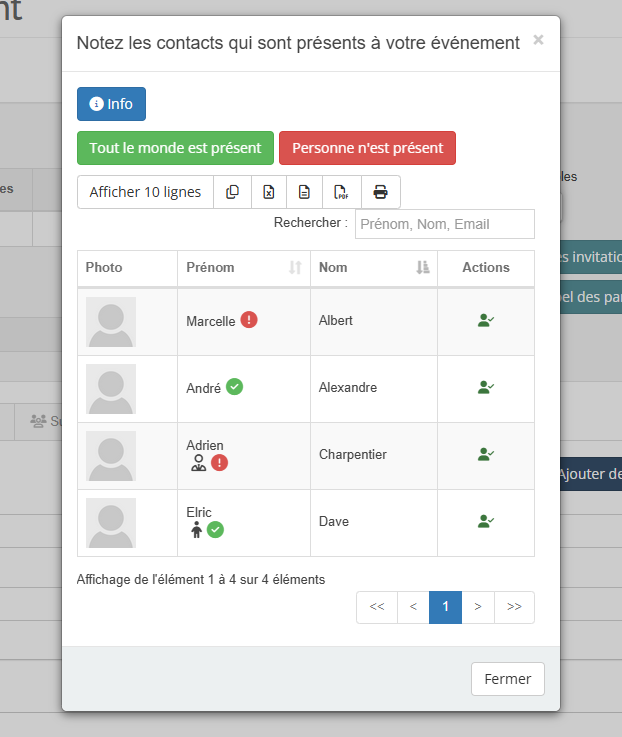 - Faire l’appel des participations : Le jour de l’événement, une fonctionnalité qui permet de faire l’appel des participants pour confirmer leur présence. Une interface dédiée affiche la liste des invités, permettant de :