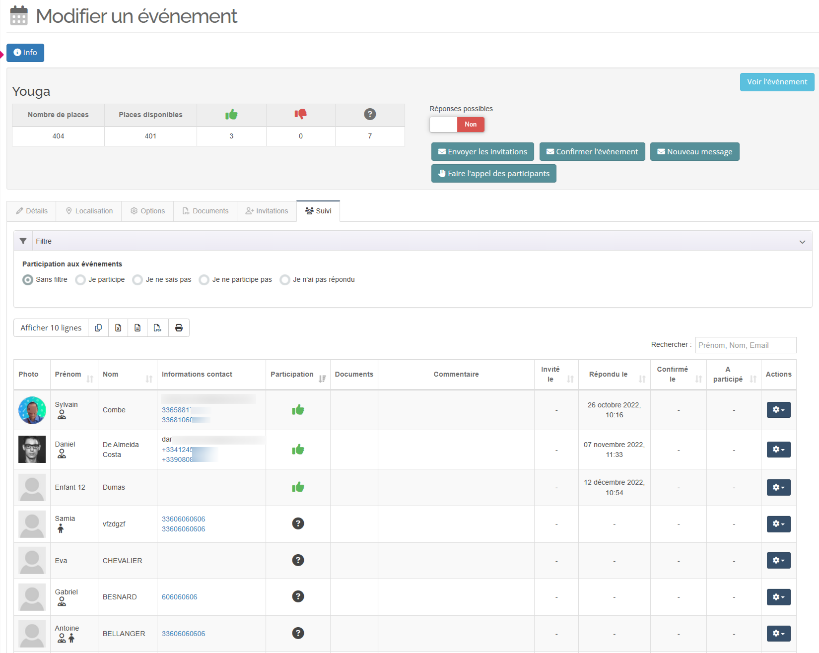 Une fois que des membres ont été invités à participer à l’événement, une nouvelle zone apparaît au dessus des onglets, présentant la synthèse des participations de vos membres, un système de filtres sur les réponses ainsi que quatre boutons d’actions :