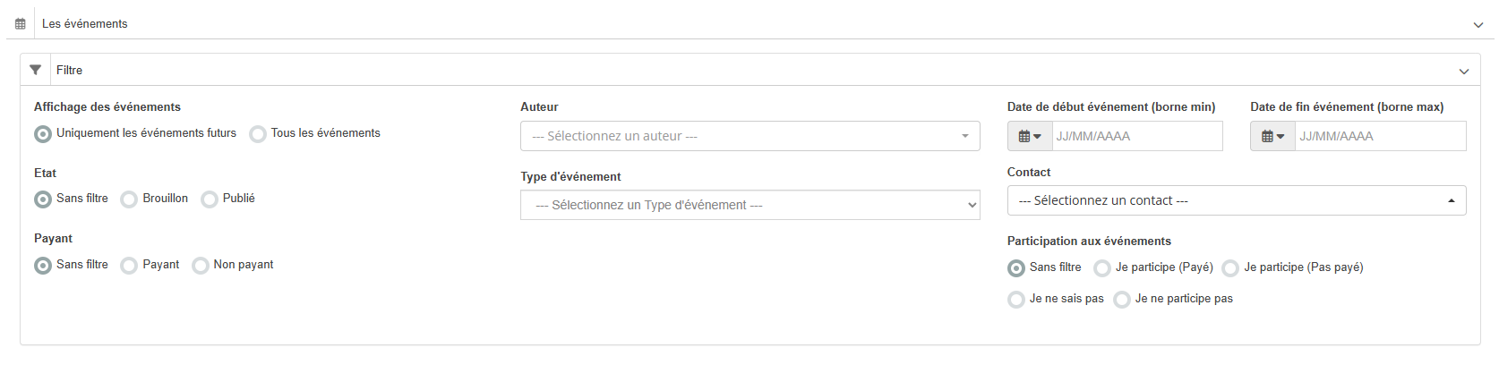 Vous pouvez choisir d’afficher uniquement les événements futurs ou tous les événements, et filtrer selon l’état de l’événement : brouillon, publié, ou sans distinction. Il est aussi possible d’affiner par événements payants ou non payants. D’autres critères vous permettent un tri plus précis : vous pouvez sélectionner un auteur spécifique, un type d’événement, un contact associé, ou définir une plage de dates en saisissant une date de début et une date de fin.