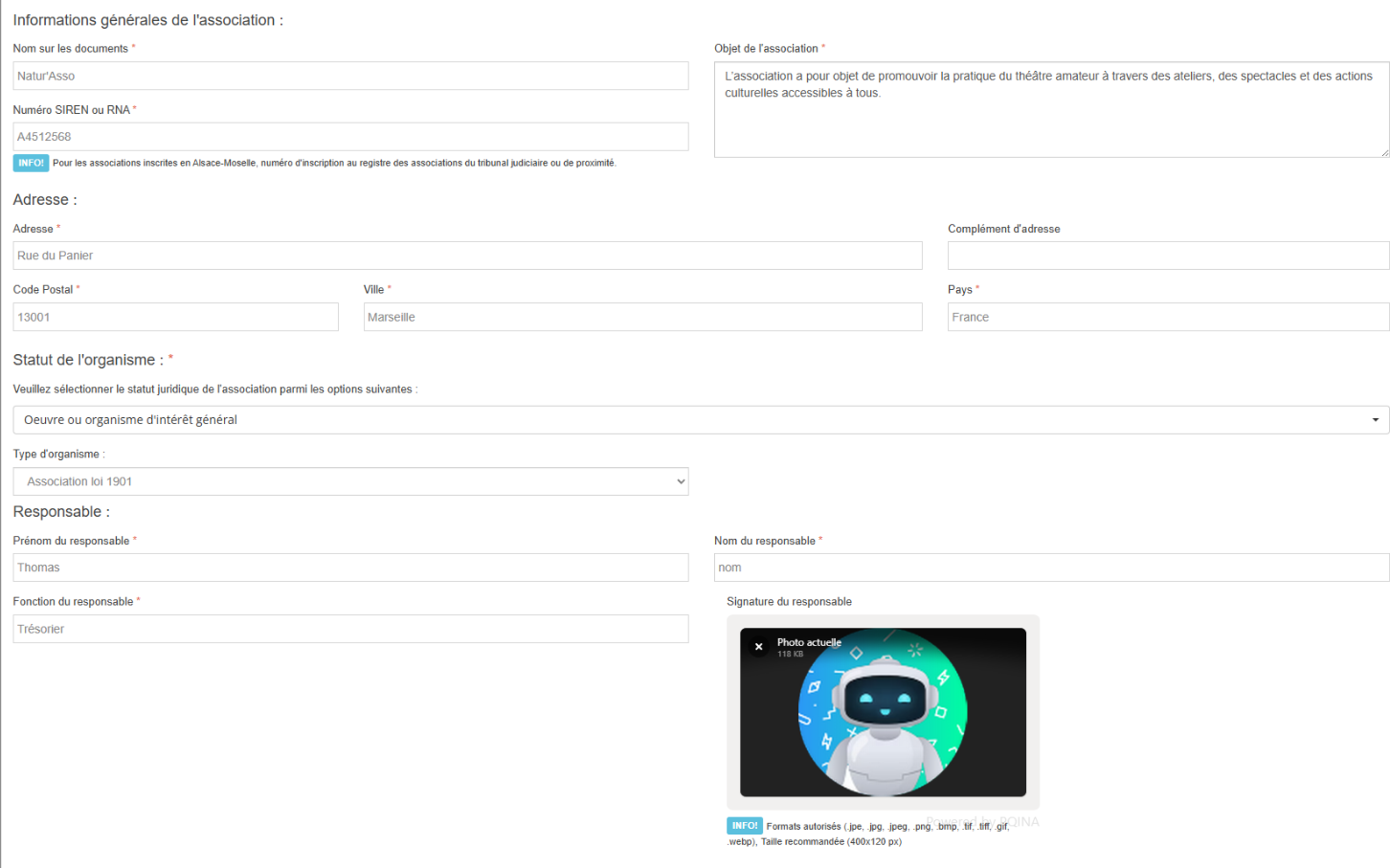 - Fonction du responsable (Président, Trésorier, etc.).