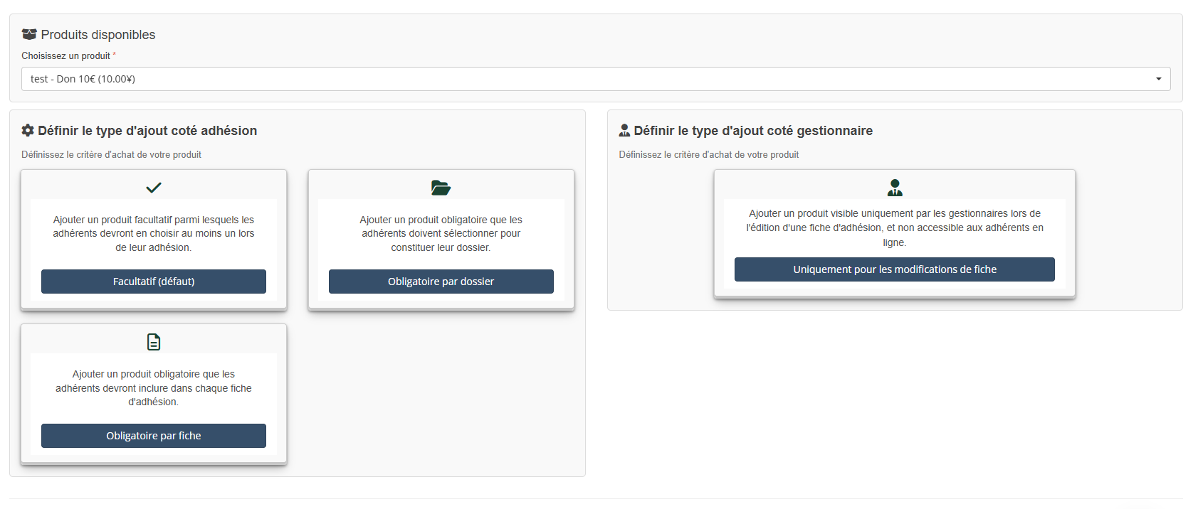 Cette étape permet d’associer à votre adhésion les produits financiers ou symboliques que les adhérents devront (ou pourront) choisir au moment de leur inscription.