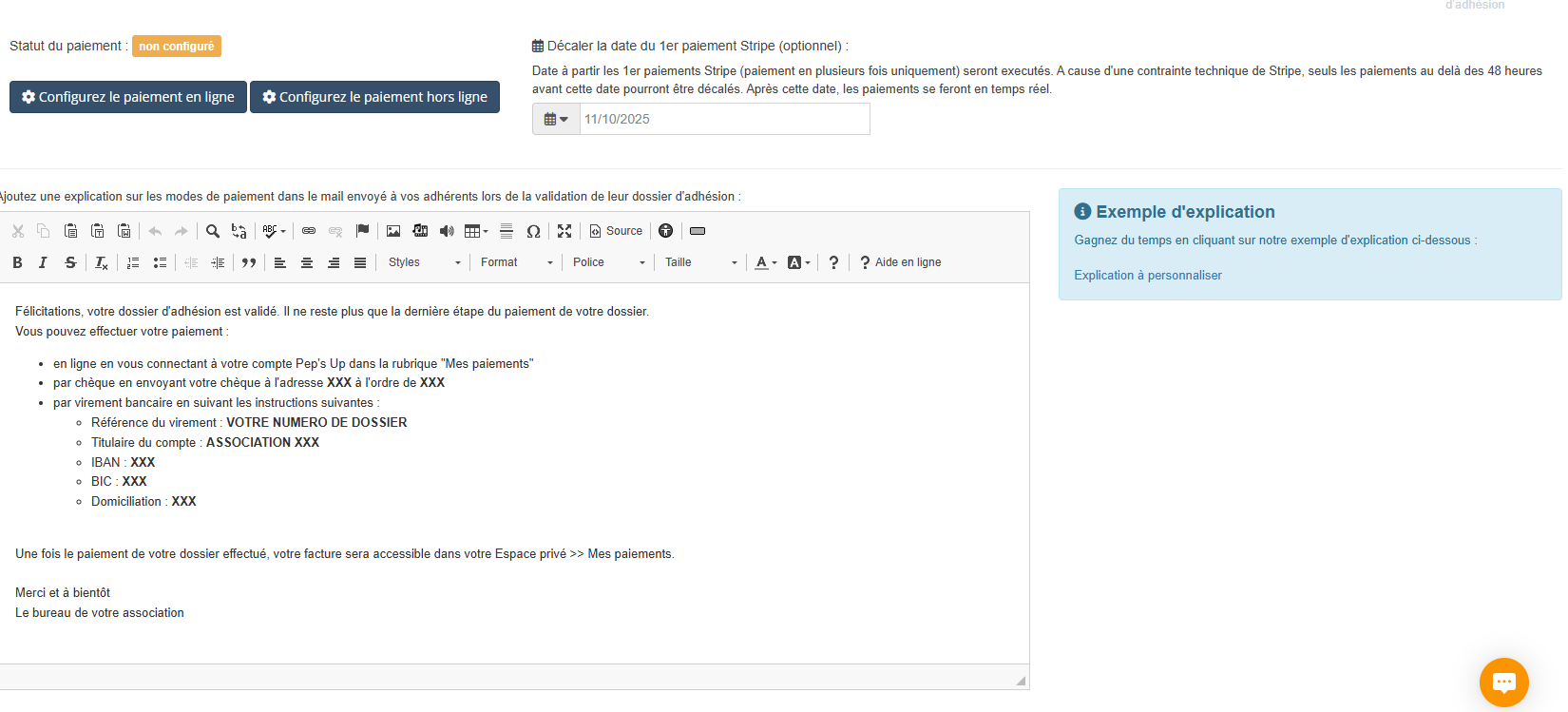 - Un grand encadré texte vous permet de rédiger les instructions de paiement qui seront envoyées aux adhérents une fois leur dossier validé.
