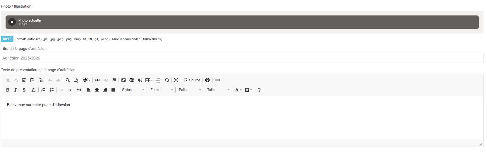 - Texte de présentation de la page d'adhésion : texte libre présentant le contenu ou les conditions de l’adhésion.