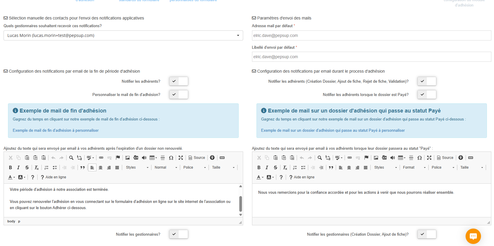 Cette étape vous permet de paramétrer et personnaliser les messages automatiques envoyés par Pep’s Up aux adhérents et aux gestionnaires à différents moments du cycle d’adhésion.