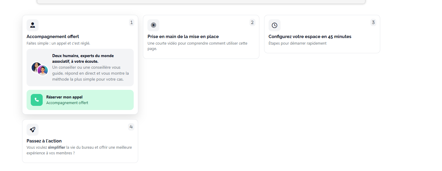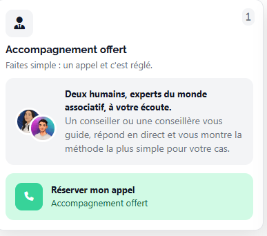 Visible directement sur votre écran, cet encart vous permet de faire appel à notre équipe à tout moment. N'hésitez pas à l'utiliser pour bénéficier d'une assistance personnalisée et configurer votre association dans les meilleures conditions !