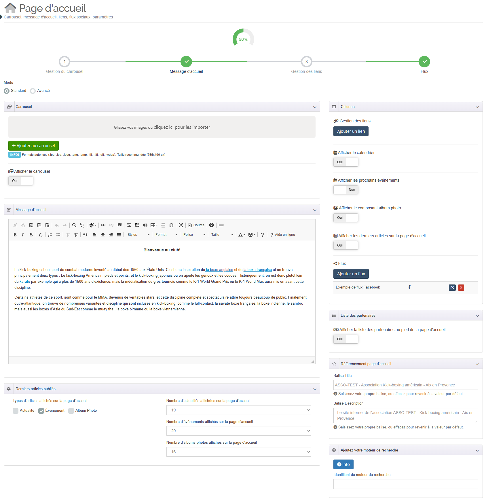 Vous allez pouvoir configurer la page d’accueil du site internet de l’association :