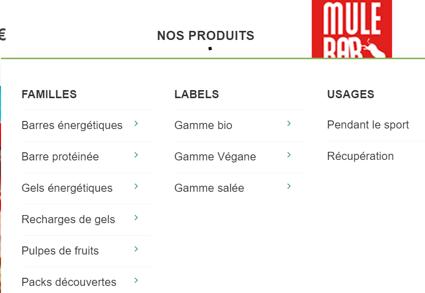 Exemple d'un menu avec plusieurs colonnes chez Mulebar (petite boîte française, j'aime bien leurs barres en rando) : "Nos Produits", 3 colonnes "familles", "labels", "usages".