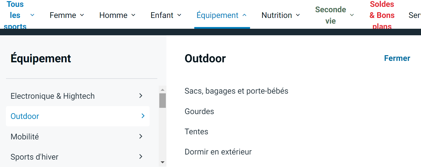 Exemple plus poussé chez décathlon : bandeau menu, qui ouvre une "fausse" popup au click, pas au survol. Par exemple le menu "Équipement". Il a 2 colonnes. À gauche les rubriques "électronique", "outdoor", "mobilité", avec une scrollbar quand la liste est longue. Puis en cliquant sur "outdoor", on a les types de produits "sacs", "tentes", "gourdes".